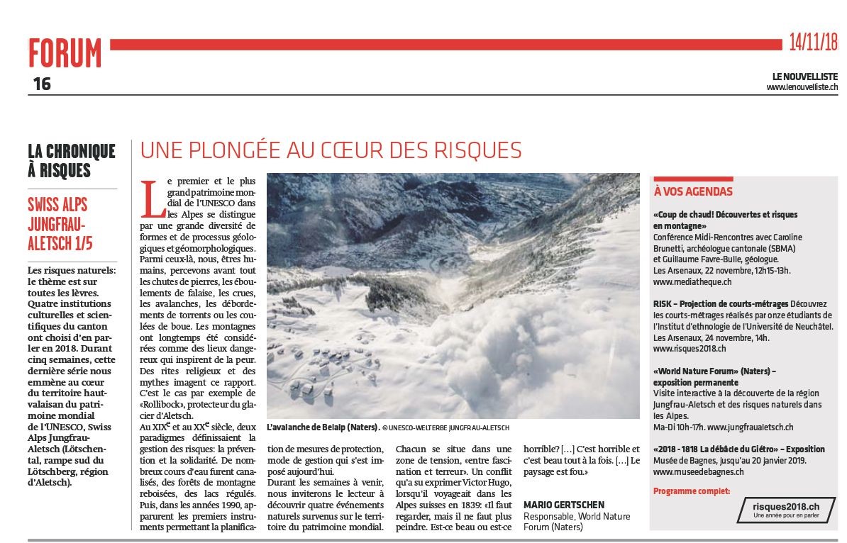 La chronique à risques 1/5, par Mario Gertschen. Responsable, World Nature Forum (Naters)
